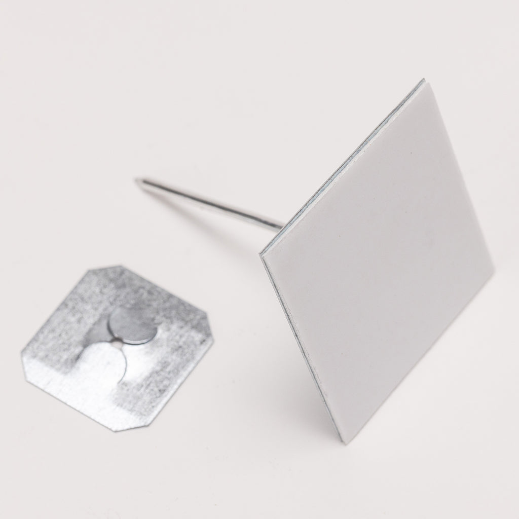 Siderise Self Adhesive Insulation Pins with Washers provide a reliable fixing method for insulation materials applied to smooth, non-porous surfaces. Each pin assembly includes a self-adhesive base, a 62mm long pin, and a washer measuring 32mm by 30mm. The pins are suitable for use on surfaces such as air ducts, sound attenuators, and machinery enclosures, where mechanical fixing of insulation is required. Installation guidelines recommend using between 8 and 12 pins per square metre to ensure secure attachment and maintain insulation integrity.